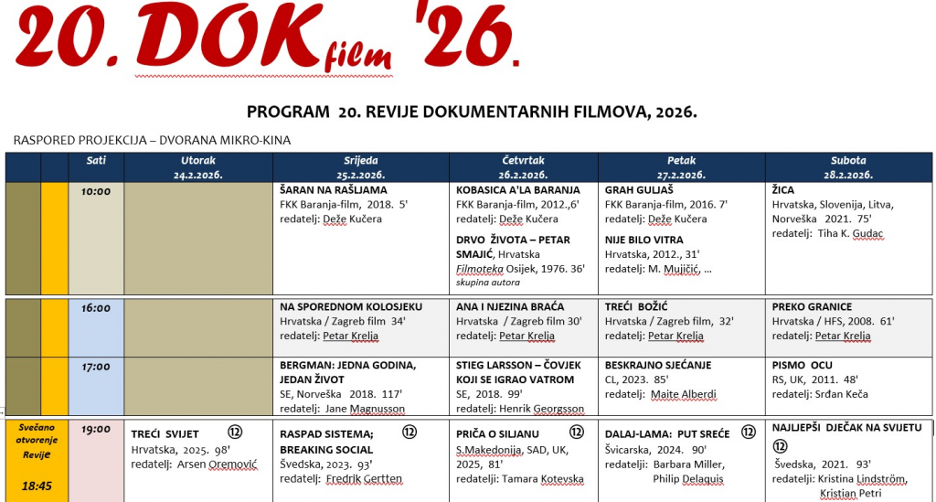 Svakoga dana ( petak i subota ) projekcije počinju u 19:00 sati u dvorani MIKRO-KINA.